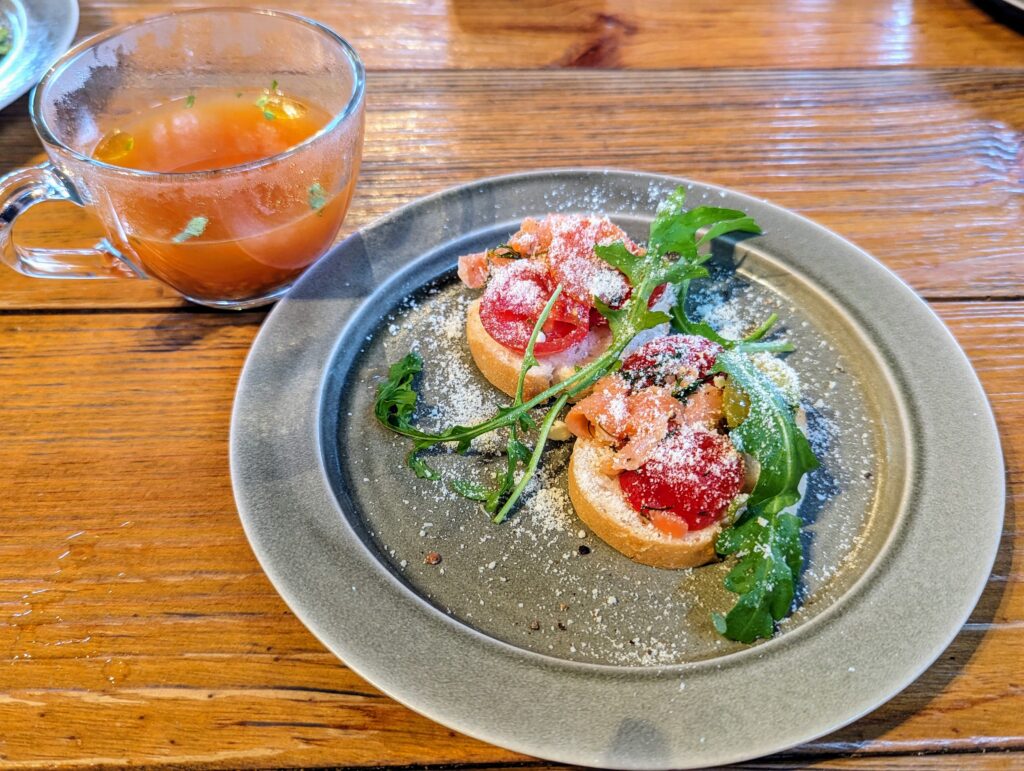トマトベースのスープとトマトの生ハム、ルッコラのオープンバゲット。