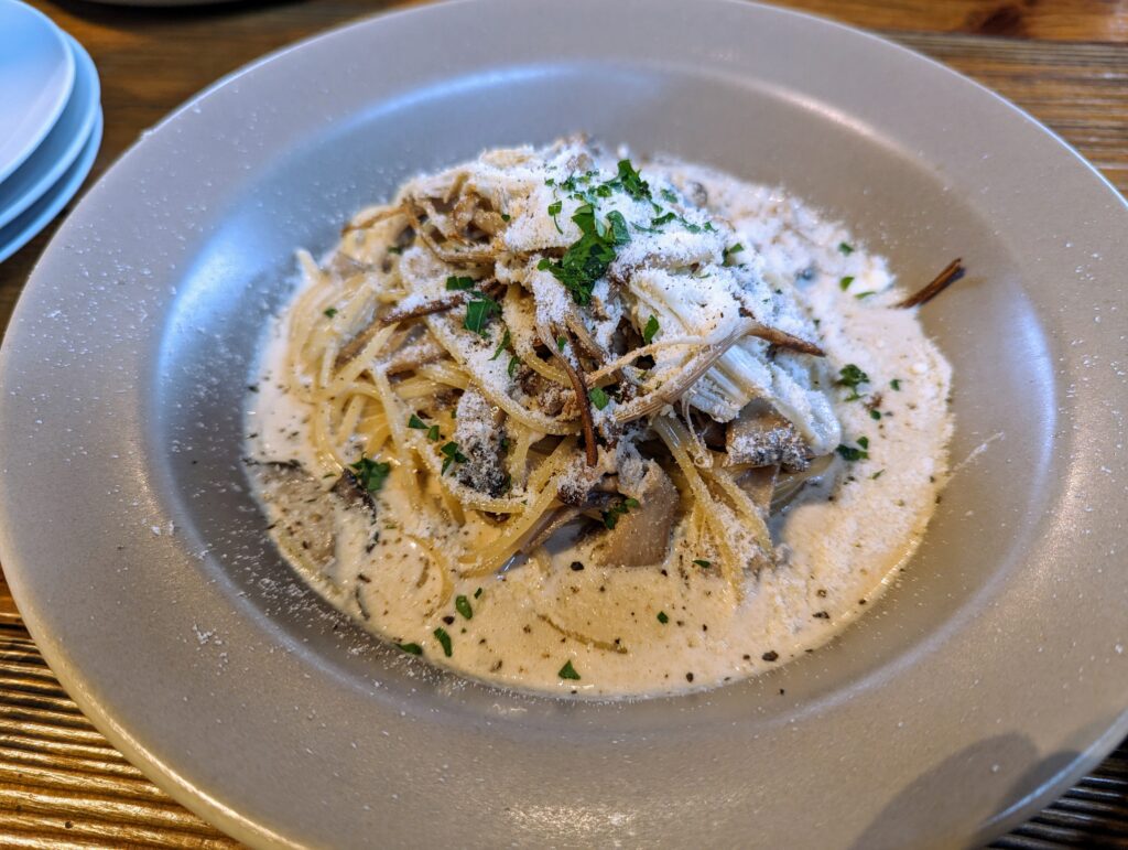 濃厚なクリームソースに色々な種類のキノコ。キノコが大好きなので、これも美味しい。