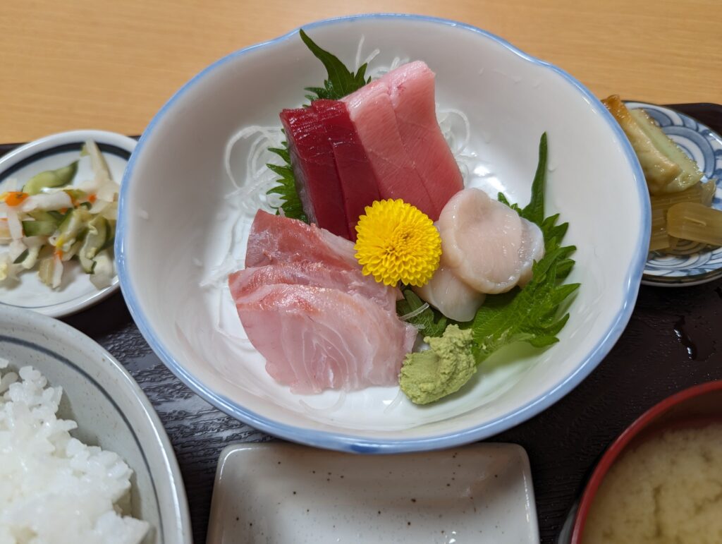 刺身、小鉢、香の物、ご飯、味噌汁の構成。