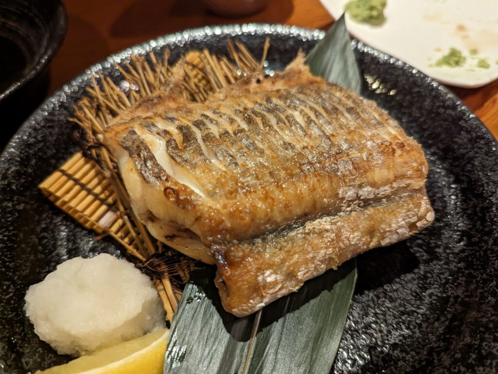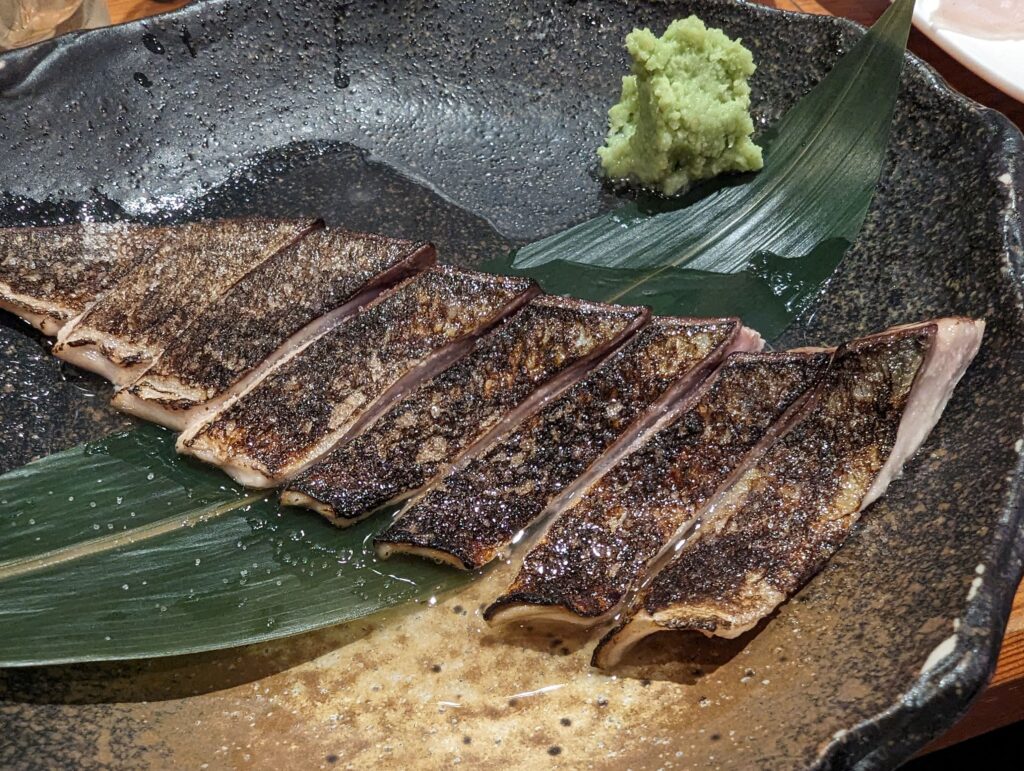 そしてお店一押しが「生鯖塩たたき」 鯖街道も近いためか、鯖がおすすめなんですね。 脂の乗った鯖の皮の部分を香ばしく炙っており、見た目は地味ですがめっちゃ美味。 友人がとても気に入って、2皿も頼んでしまいました。