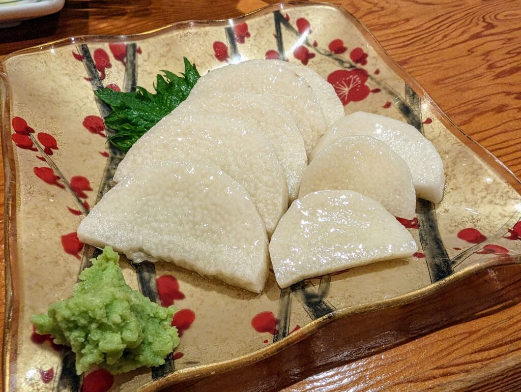 優子と冬美のメニュー欄から長芋のお漬物。 近隣のお母さんの手作り料理とのこと。 シャキシャキの食感と程よい塩味がよき箸休めに。
