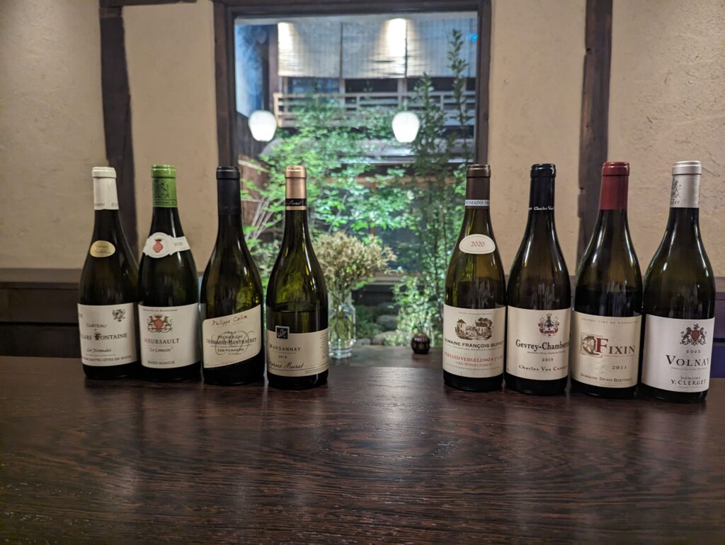 こちらは看板にもある通り、ブルゴーニュワイン専門のバーで、 その日のおすすめブルゴーニュワインを1杯3000円で楽しむことができます。 この日のラインナップは白4種、赤4種でした。