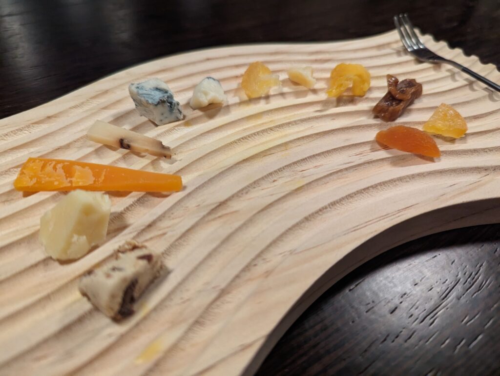 お通しはチーズの盛り合わせ。 木製の曲線のフォルムのお皿に、色々なチーズが並び、 まるで音符のように見えるのは私だけでしょうか。