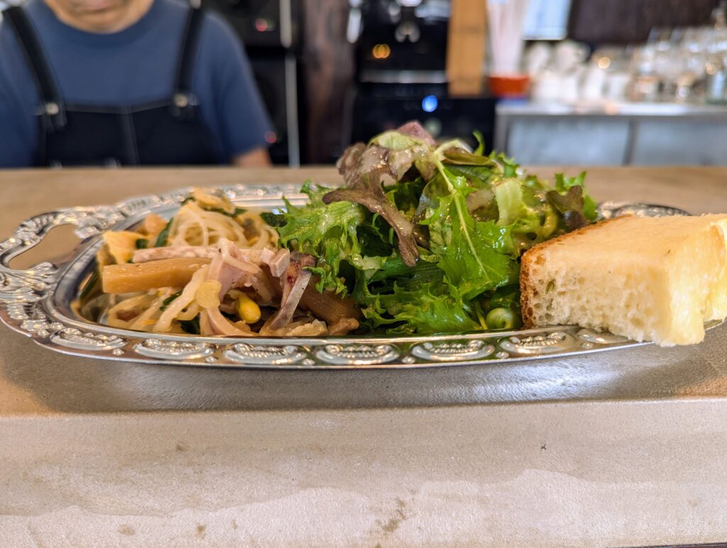 まずは前菜の登場。サラダにビーフン、中華サラダ、そしてフォカッチャまで。イタリアンの枠を超えた創作性豊かな一皿。 意外性がありますね。