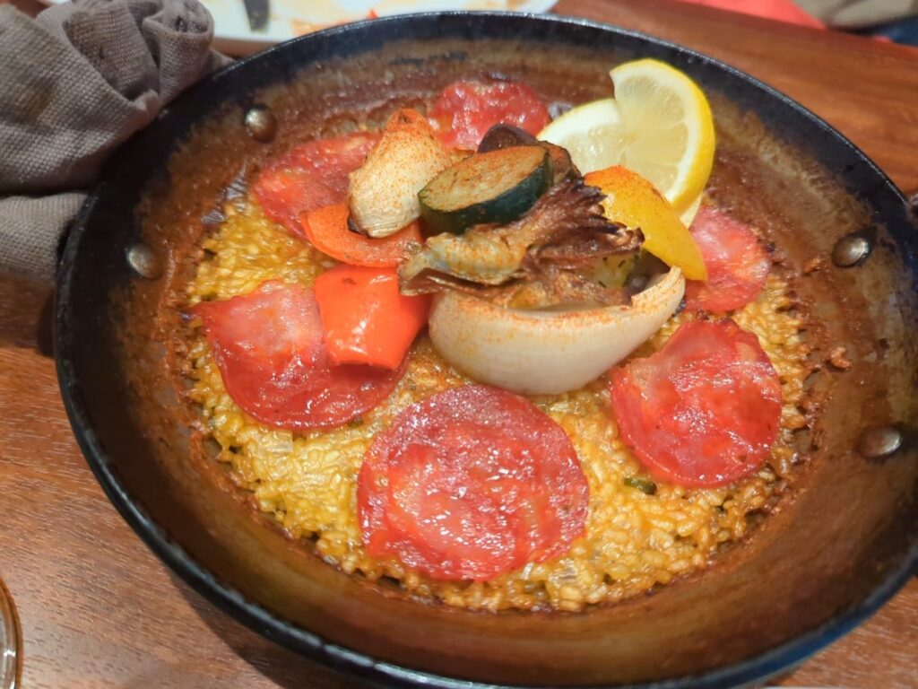 チョリソーの旨味とキノコの組み合わせがいい具合のパエリア。