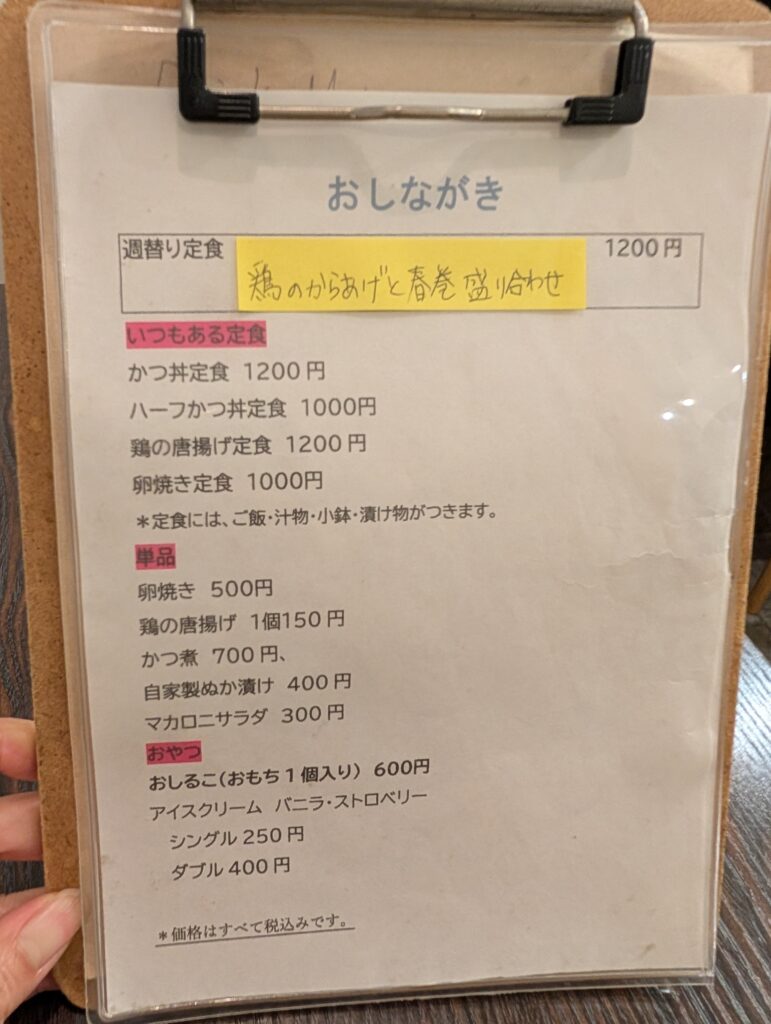 メニューは定食を中心に、カツ丼や唐揚げ、卵焼きなど、ほっとする家庭料理が揃っています。定食セットのほかに、おかずを単品でも注文できるので、夜のちょい飲みにも最適です。