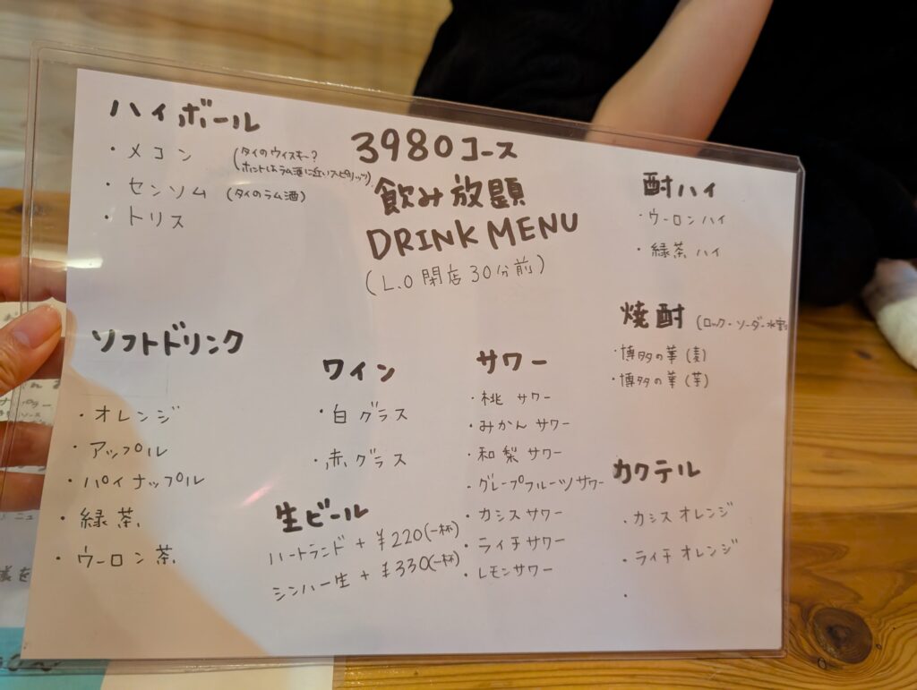 飲み放題メニューは、タイのウイスキー「メコン」を使ったハイボールやサワーや酎ハイ、ワイン、そしてノンアルコールなど、種類も豊富。