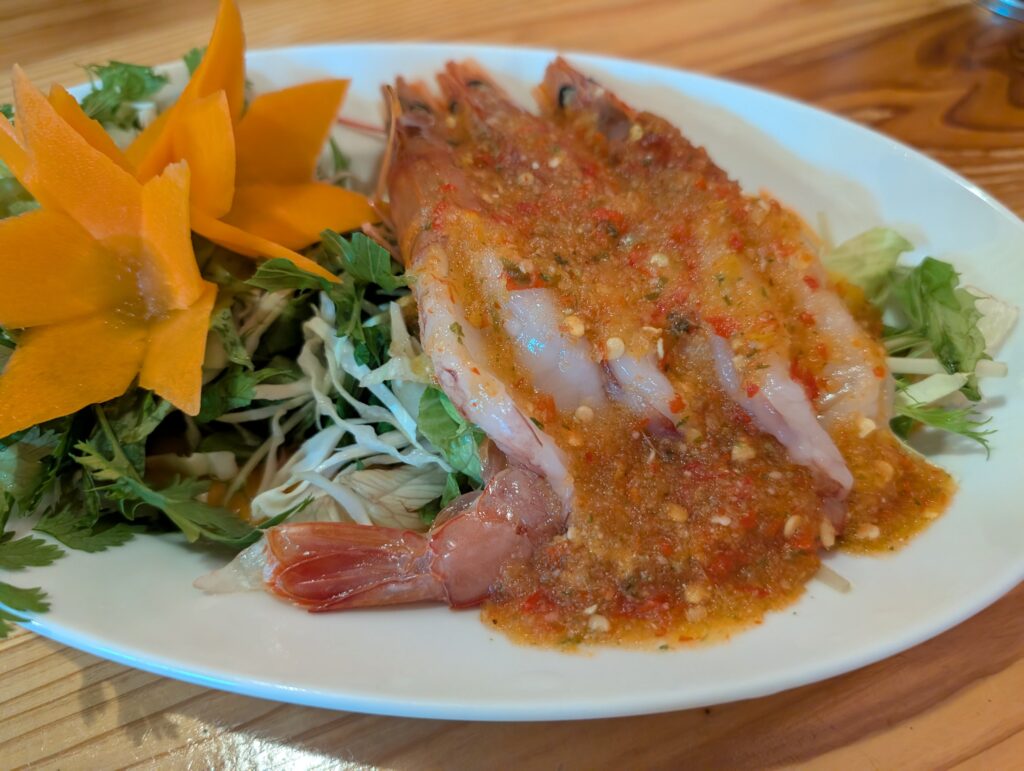 大きい赤海老のお刺身にシェフ特製のスパイスソースで。 このピリ辛ソースがめちゃくちゃ美味しい。