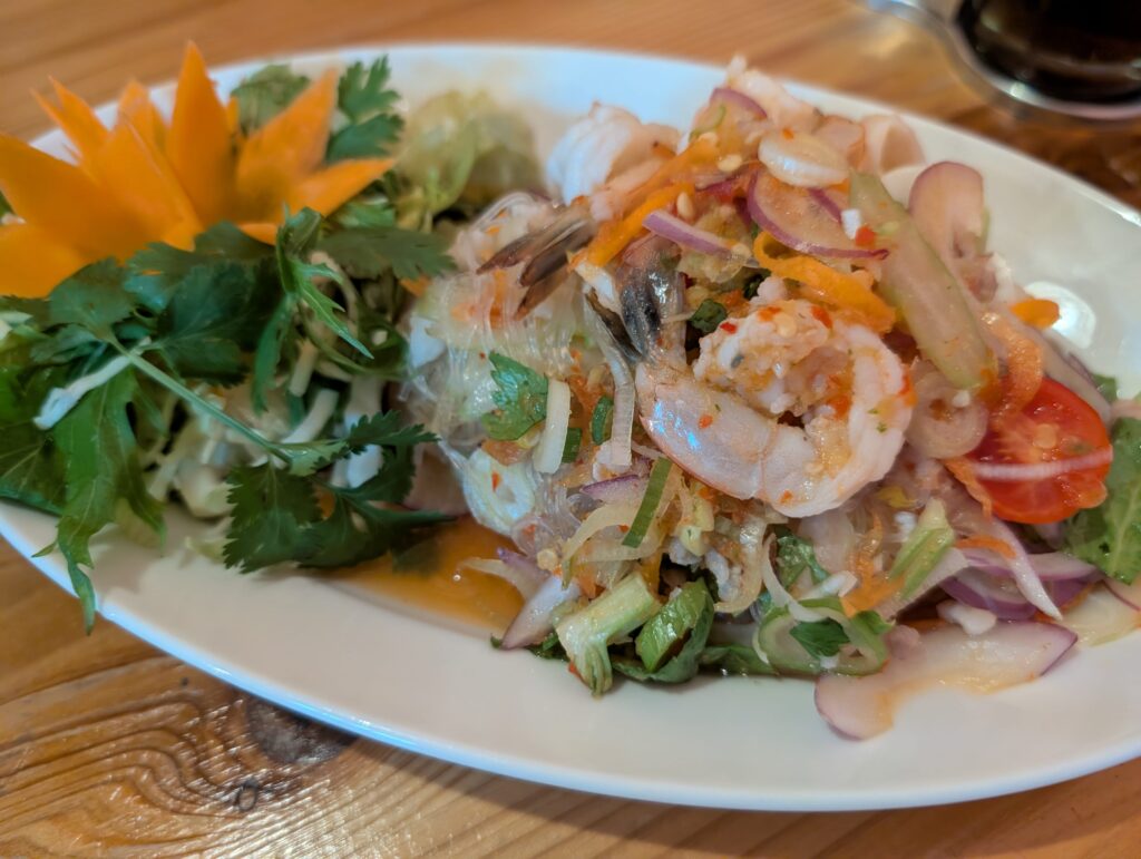春雨とシーフードの温かいピリ辛サラダ。 こちらもシェフ特製のピリ辛で酸っぱ美味いソースがたっぷり。 病みつきになる美味しさです。