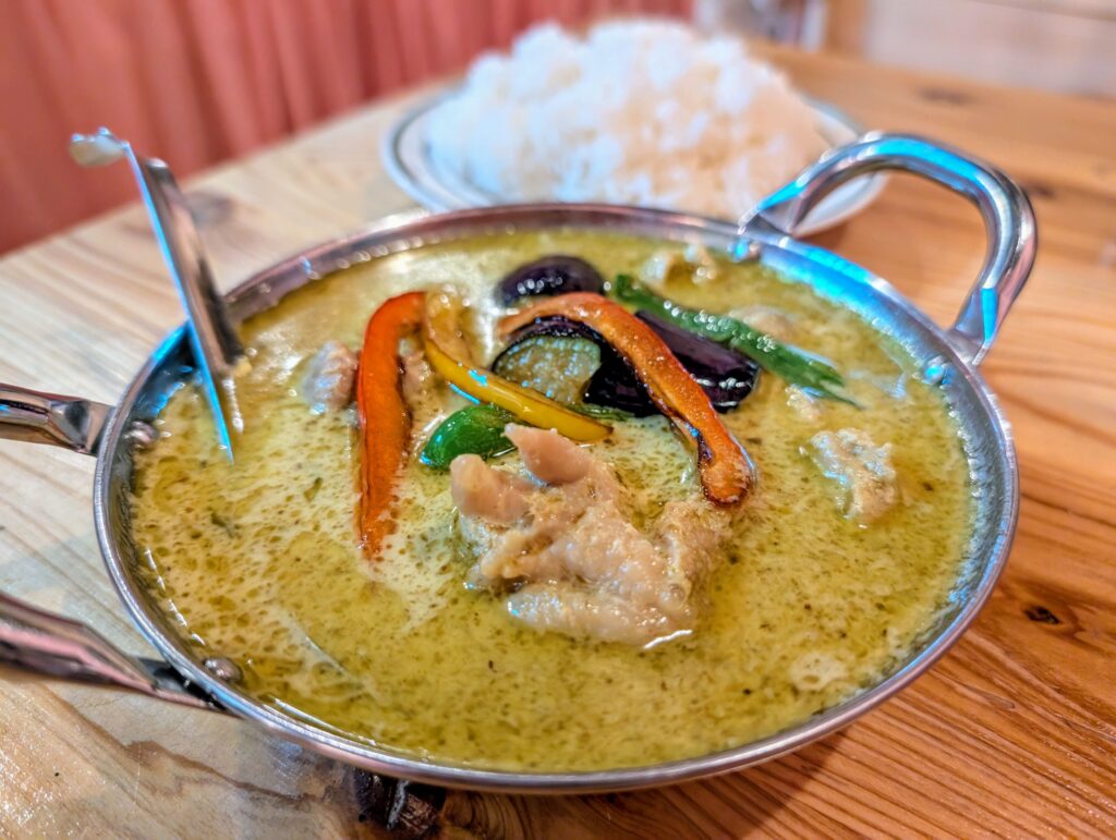 こちらはグリーンカレー。大きな鶏肉とお野菜がたっぷり入っています。 辛さと濃厚な旨みの中に、ココナッツのまろやかさが効いていて、辛旨。