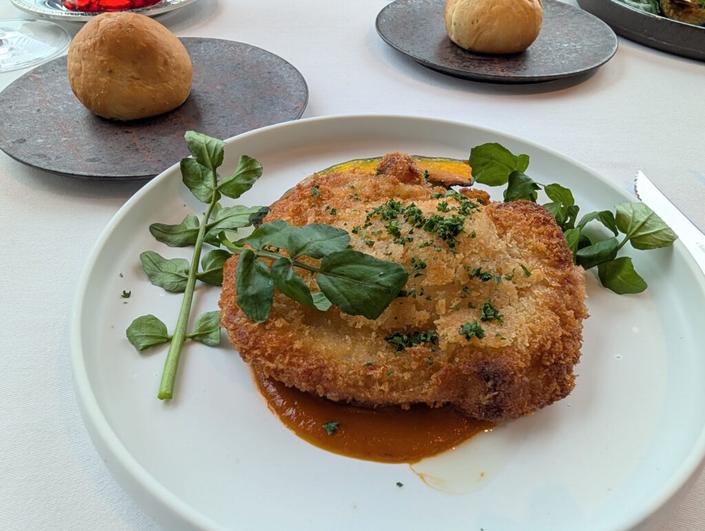 「漢方三元豚のコルドンブルー | 9種のエピス香るウスター」では、 漢方三元豚の中にトマト、大葉、モッツァレラを仕込んだ上質なカツレツを楽しめました。 脂の甘みとジューシーさが格別です。