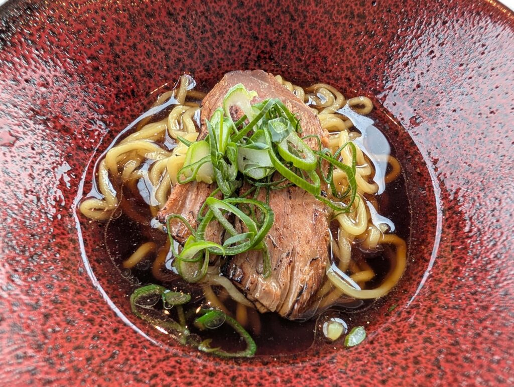 〆には「漢方三元豚のウコン麺」を。 しっかり目のスープにウコンを練り込んだ麺は、なんだか体に良さそうな印象です。