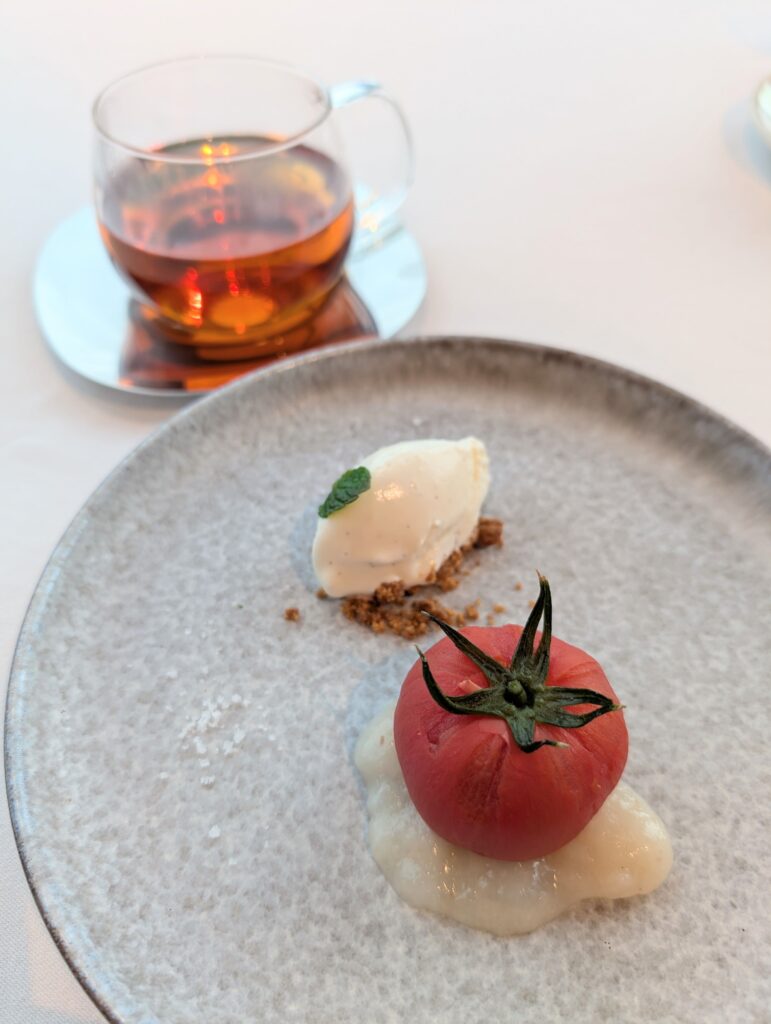 デザートは「トマトのコンポート ライチのコンフィチュール」。 フルーツトマトの素材の甘さを活かした、さっぱりとしたデザートで、コンフィチュールとの相性も抜群でした。