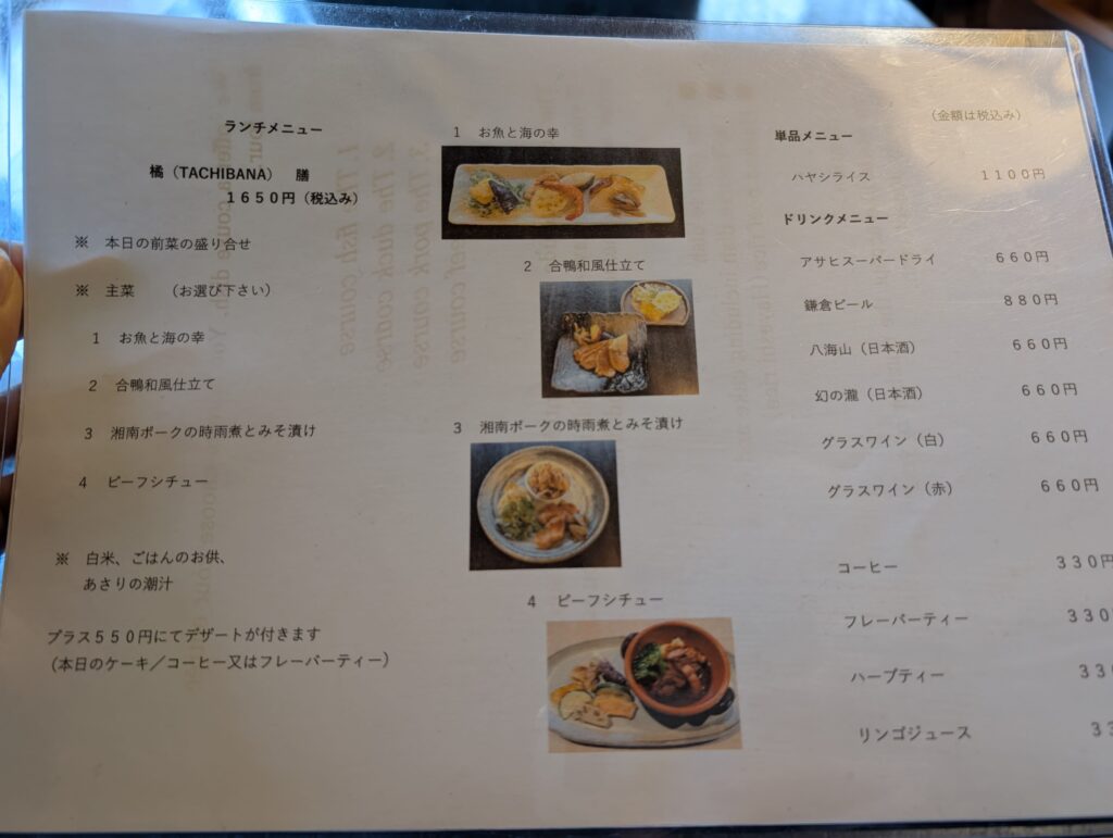 ランチメニューは「橘膳 1,650円」のコース、あとは単品などがあるようです。