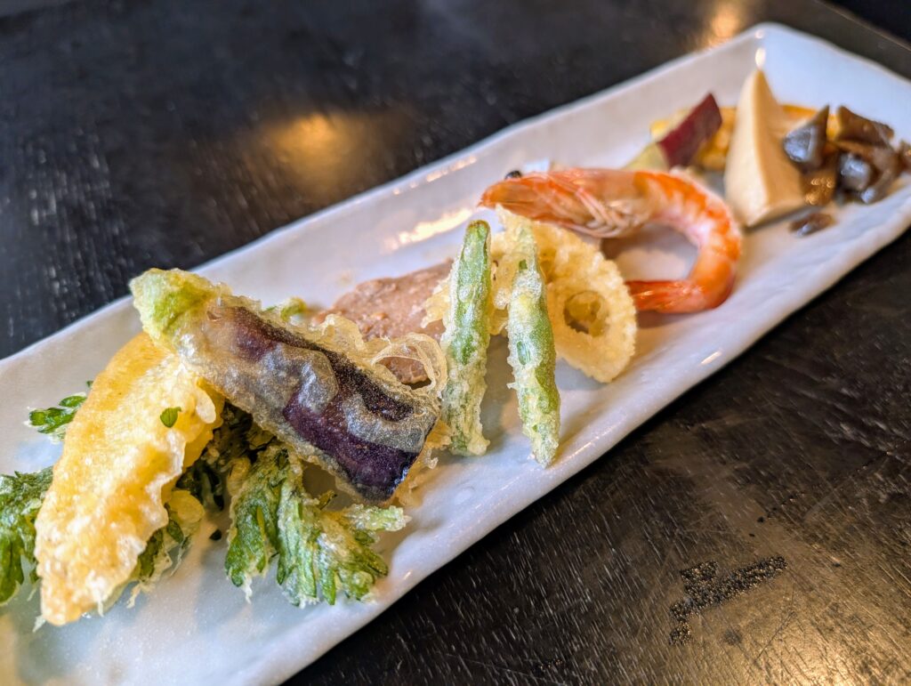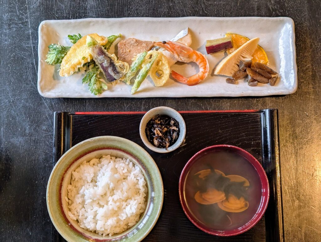主菜はカジキとサワラの焼き魚。 サクサクの揚げたて天ぷらや煮物など、品数の多さに驚きます。 別添えのひじきも絶品。