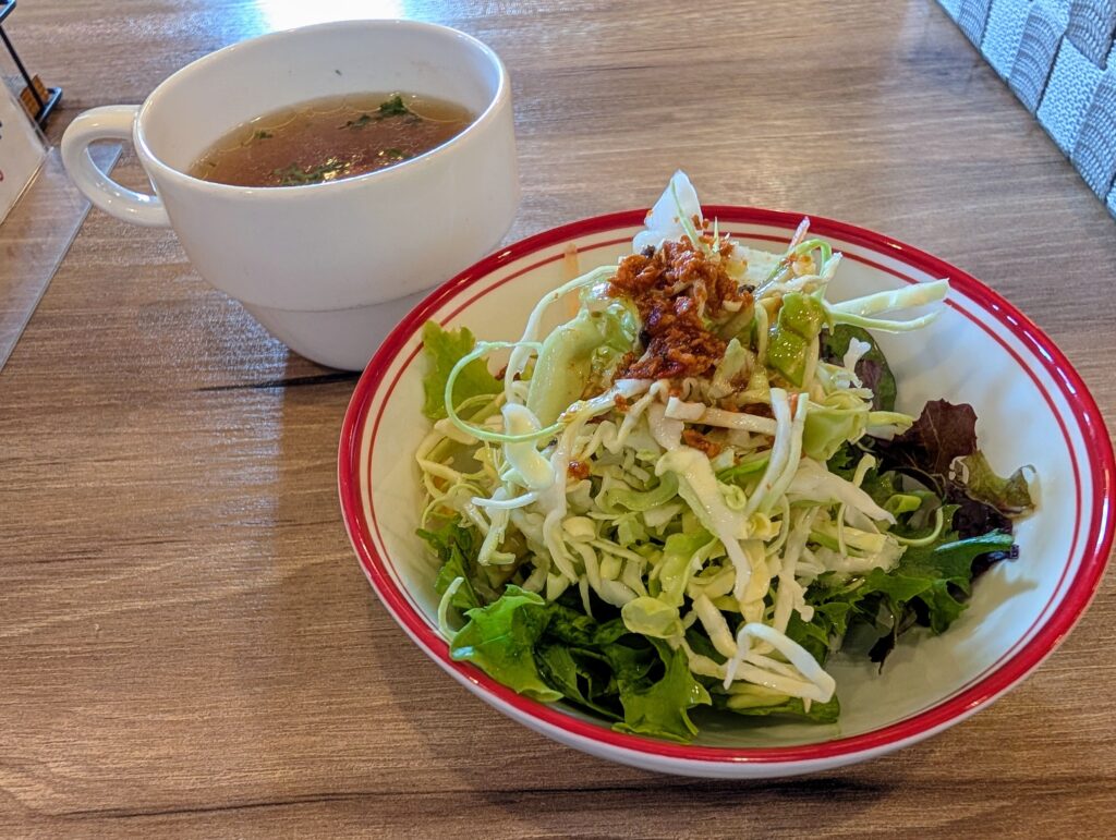 まず登場したのは、キャベツの千切りサラダとオニオンスープ。 スープは少し胡椒が効いていて、食欲をそそる香りが立ち上ります。