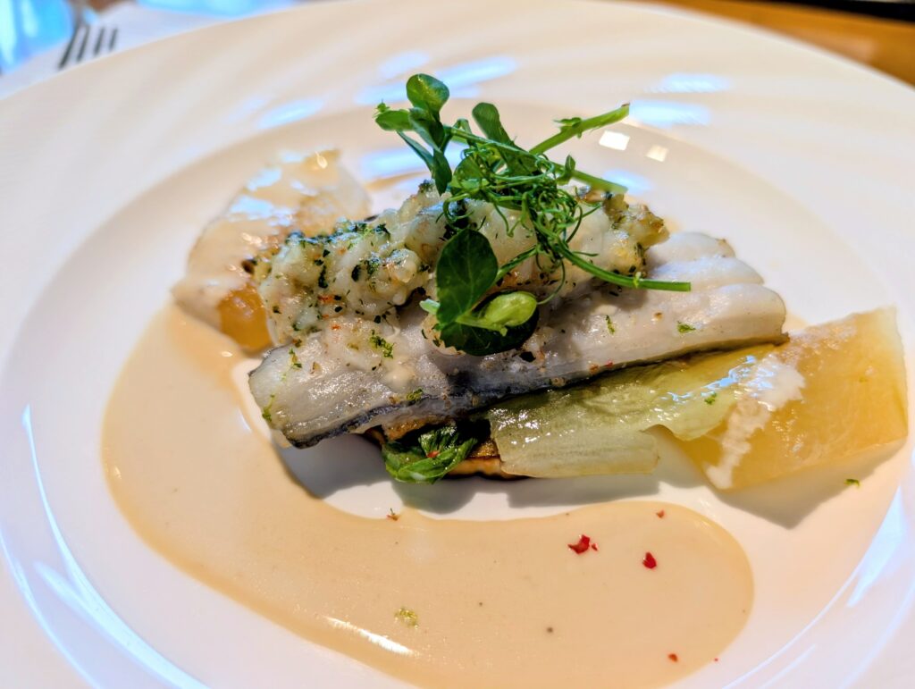 ふんわりと優しい食感の太刀魚に、冬瓜や小エビ、柑橘がアクセントのソースが添えられています。味の複雑味が楽しめる、計算し尽くされた一皿です。