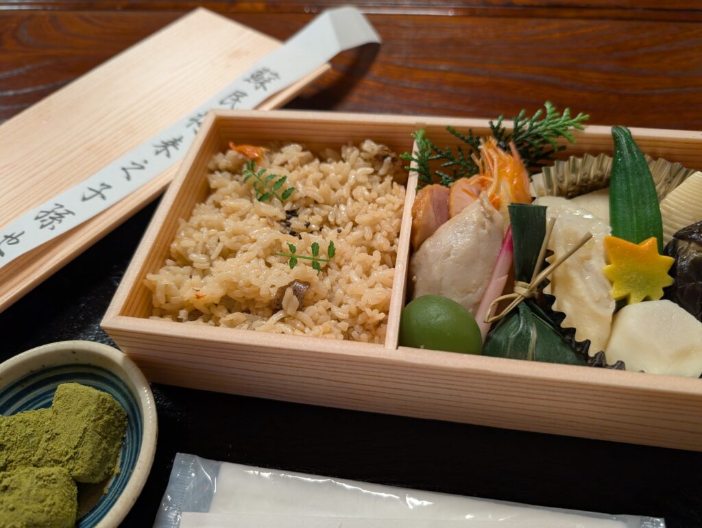折詰のほかには、具だくさんのお味噌汁と、 デザートに抹茶の葛餅も付いてきました。