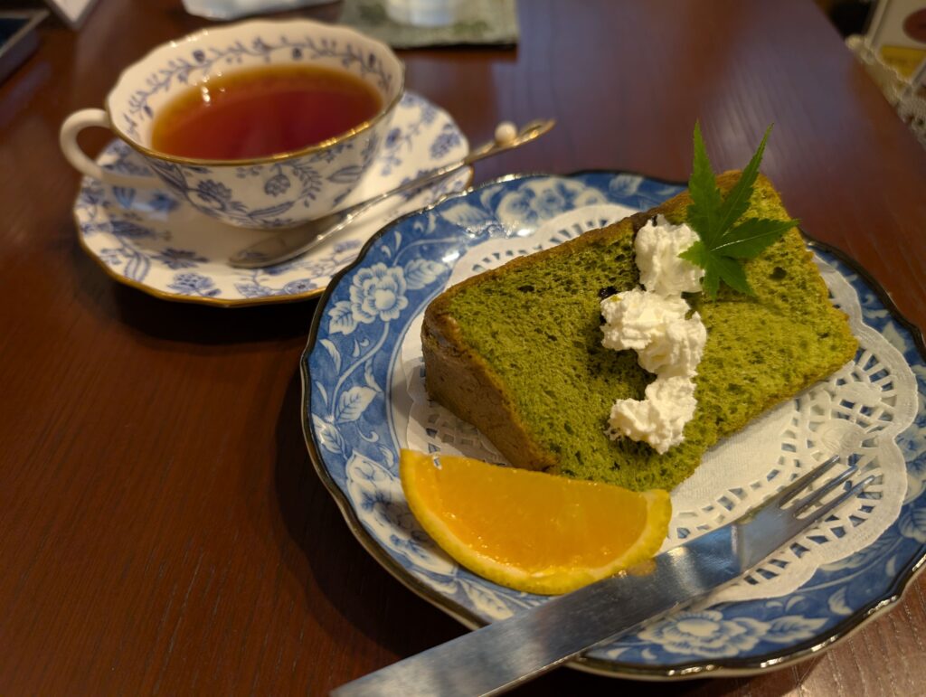 抹茶のシフォンケーキには生クリームとオレンジが添えられています。 訪問時は夏だったので、季節の夏柑糖も気になりましたが、 今回は抹茶のシフォンケーキをチョイス。紅茶はホットで。