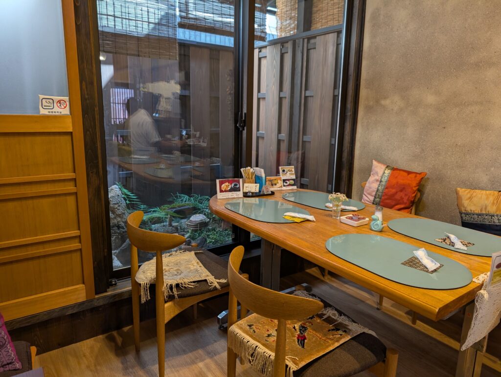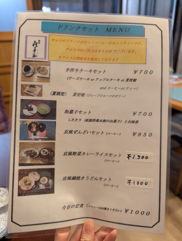 手作りケーキセット以外にも、和菓子セット(祇園祭菊水鉾のお菓子とお抹茶)やぜんざい、さらには京風野菜カレーや鍋焼きうどんなど、食事メニューも充実しているので、モーニングだけでなくランチタイムにも利用できます。