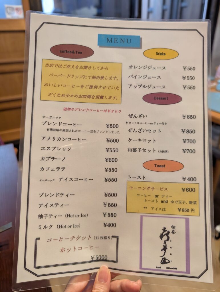 お店にはモーニングサービス(600円)があり、 コーヒーまたは紅茶にトーストとゆで玉子、 野菜がついてきます。アイスの場合は650円とのこと。