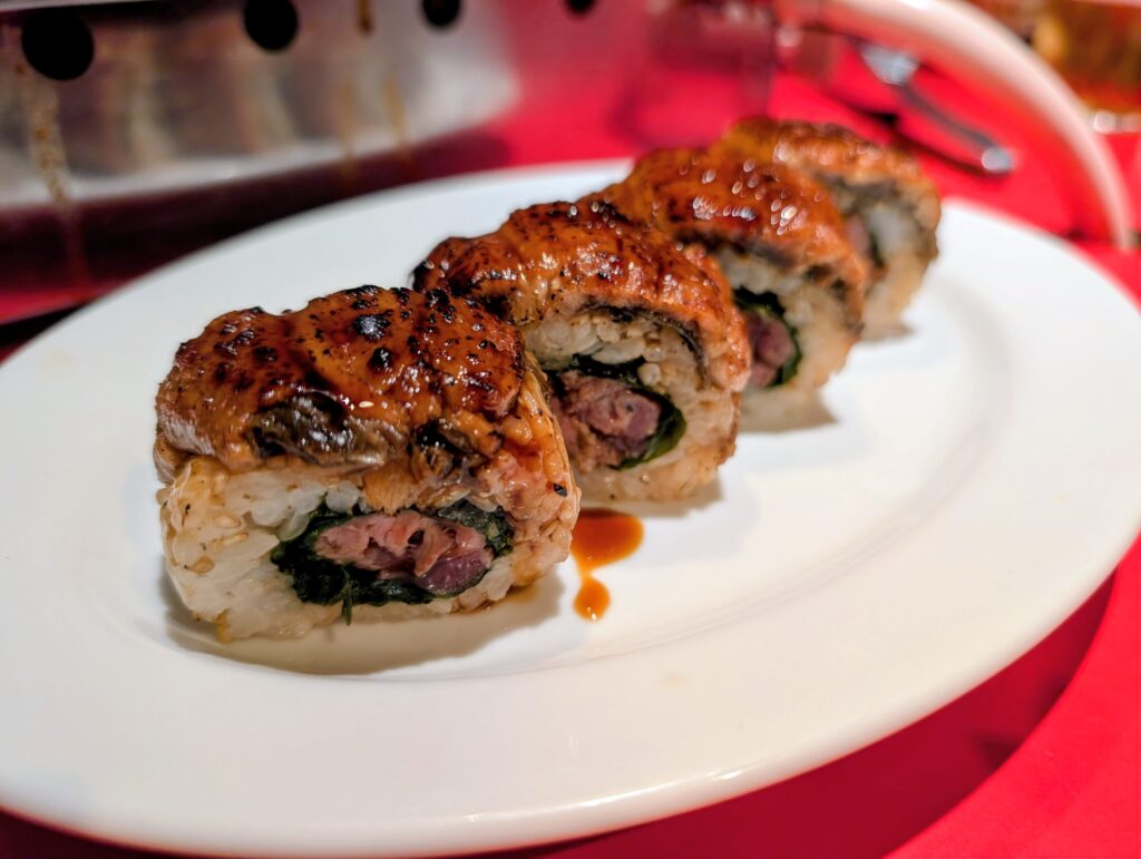 最初からお腹に溜まる鰻の棒鮨が登場します。 ボリューム満点で、にくがとうグループならではの遊び心を感じる一品です。