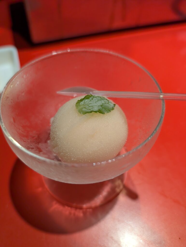 前半戦の締めくくりは、さっぱりとした桃のシャーベット。 口の中をリセットして、いよいよ後半戦に備えます。