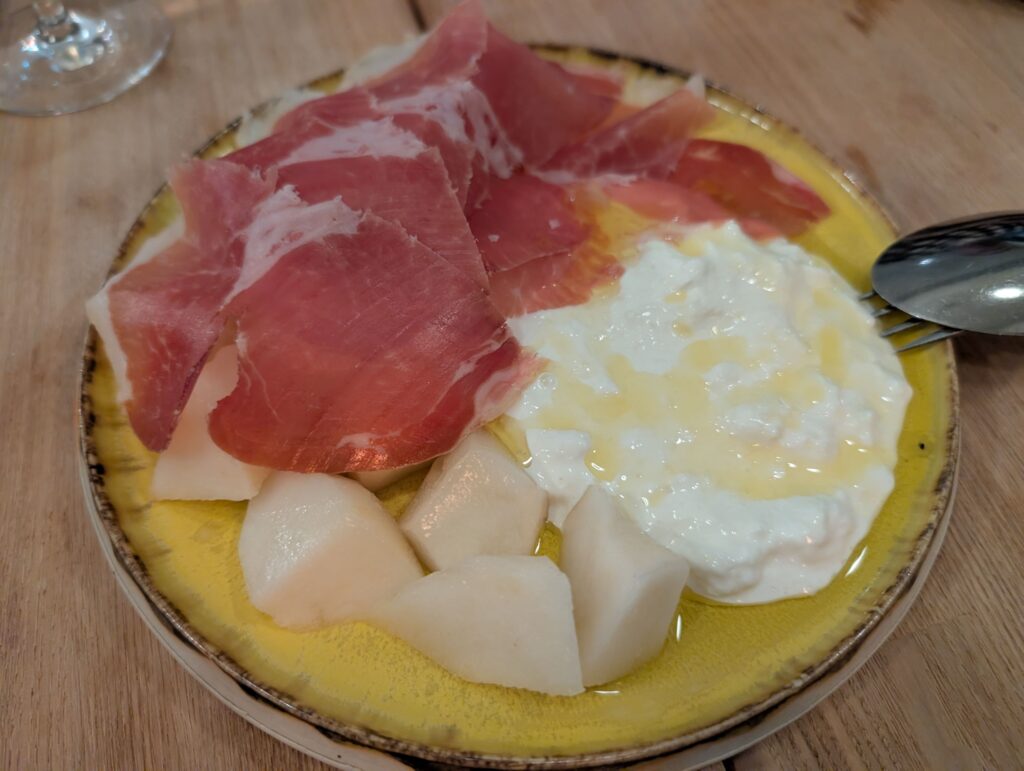 旬の洋梨に、塩気のある生ハムとクリーミーなストラッチャテッラチーズを合わせた一皿。