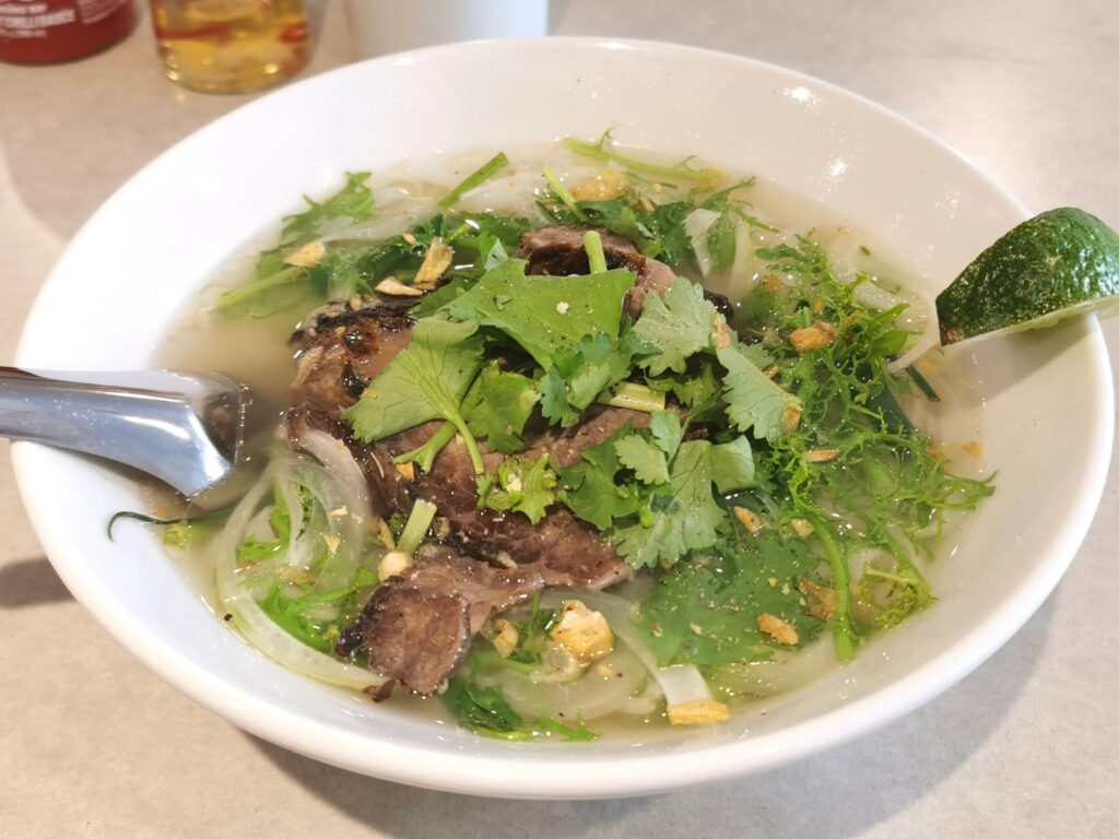 この日は「牛肉のフォー900円」をいただきました。 出てきたフォーには優しめのスープにたっぷりの野菜やパクチー、そして厚切りの牛肉が2枚と食べ応え十分。
