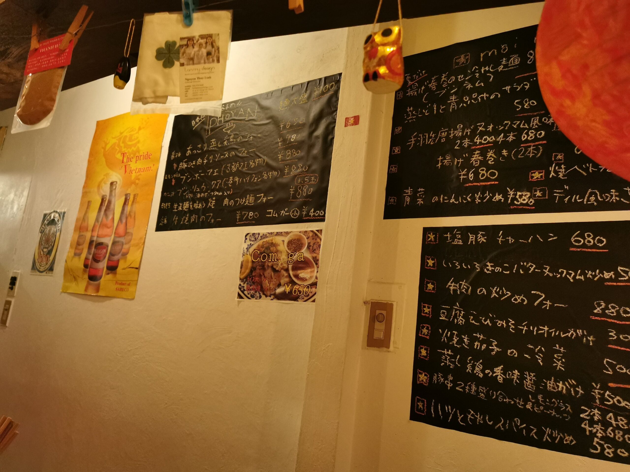 メニューは壁に貼られています。 フォーが6種類ほど、おつまみメニューは品数が多く本格的でびっくり!