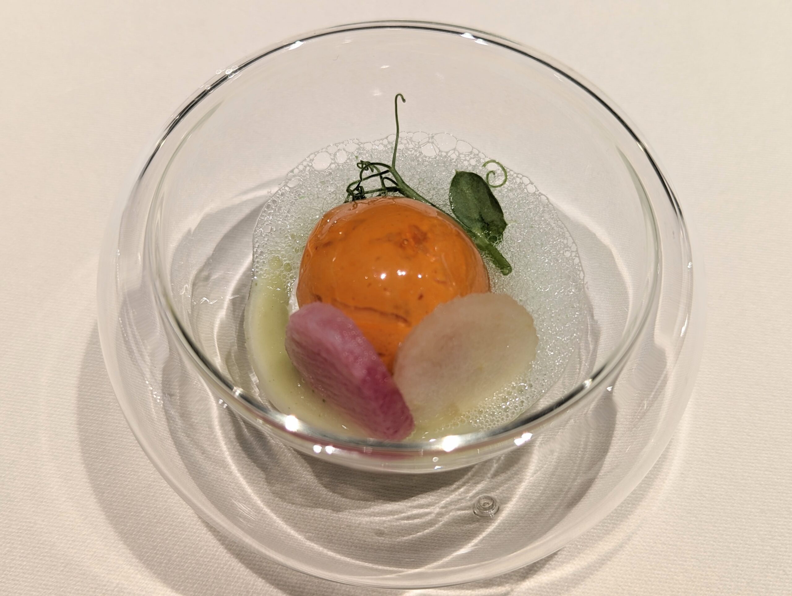 Amuse ズワイガニとパプリカ 新緑のエミュルッション パプリカのオレンジが目にも鮮やかで、その下にはズワイガニの身が。 さわやかなグリーンピースの泡ソースが味にさわやかさをプラスします。