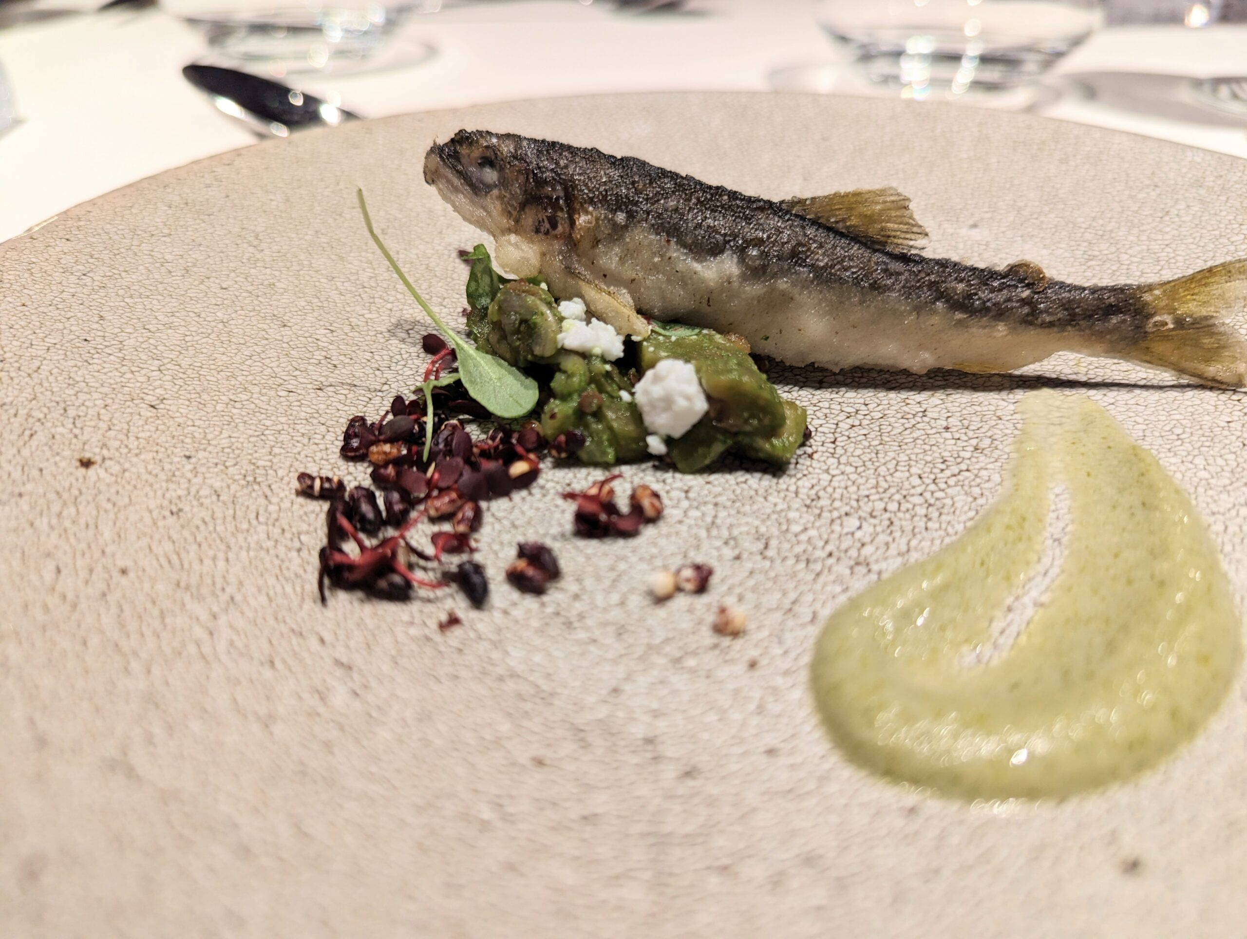 Entrée 稚鮎と茄子のデクリネゾン タップナードヴェール 黒米フリット お皿をキャンバスのように見立てて、今にも動きだしそうな稚鮎のフリット。 黒豆のフリットの香ばしい食感に内臓の苦みが大人の味。何とも美味しく楽しい一皿。