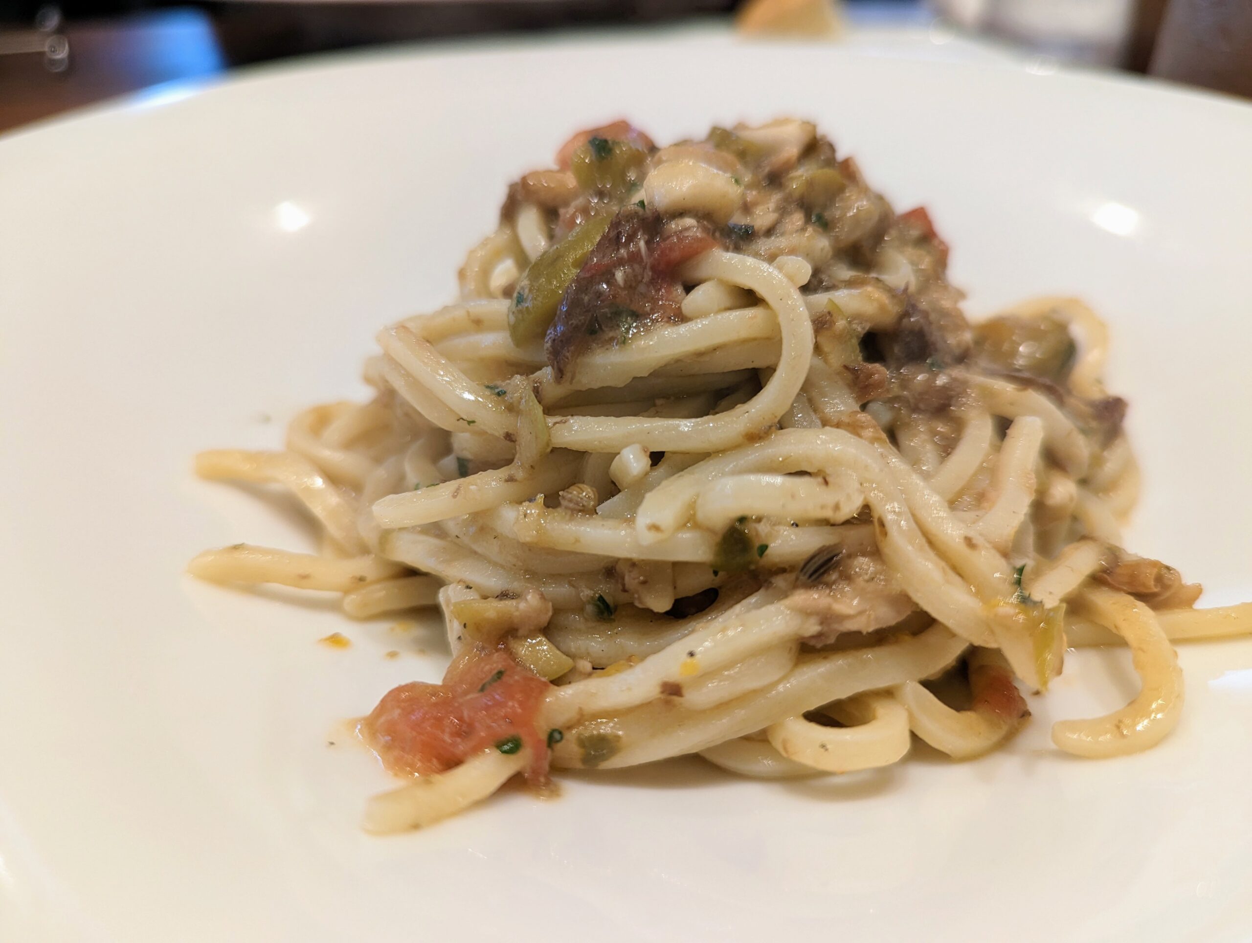 四角い断面のキッタラはソースがよく絡みます。 イワシだけでなくケッパーそしてハーブたちで味の複雑味を出し 食感にナッツが入っていて、パーフェクトなパスタでした。
