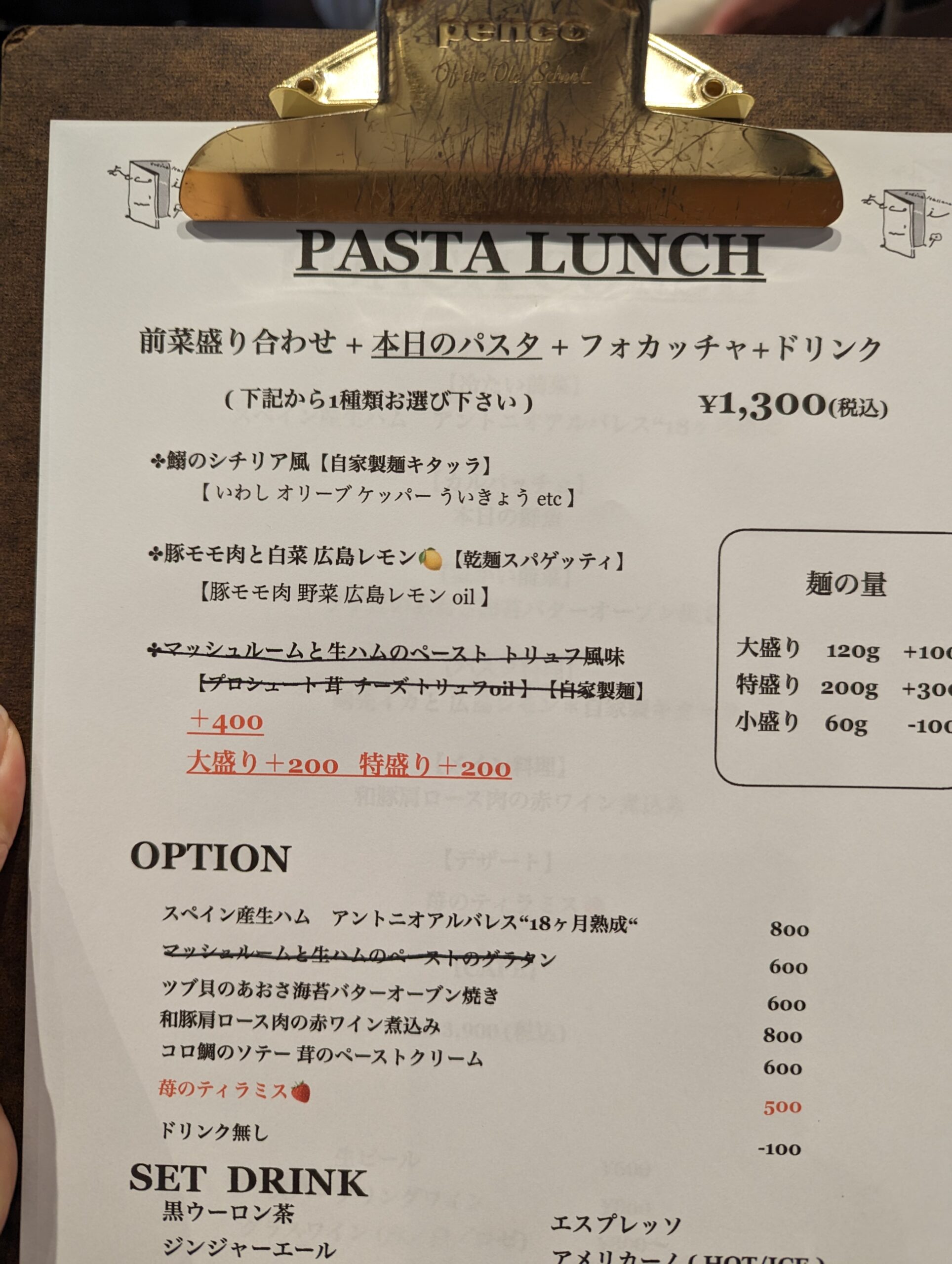 パスタは品切れもありましたが、3種類から選べるようです。 追加でお料理も選べるようで、昼からゆっくりワインを飲む時に良さそう。