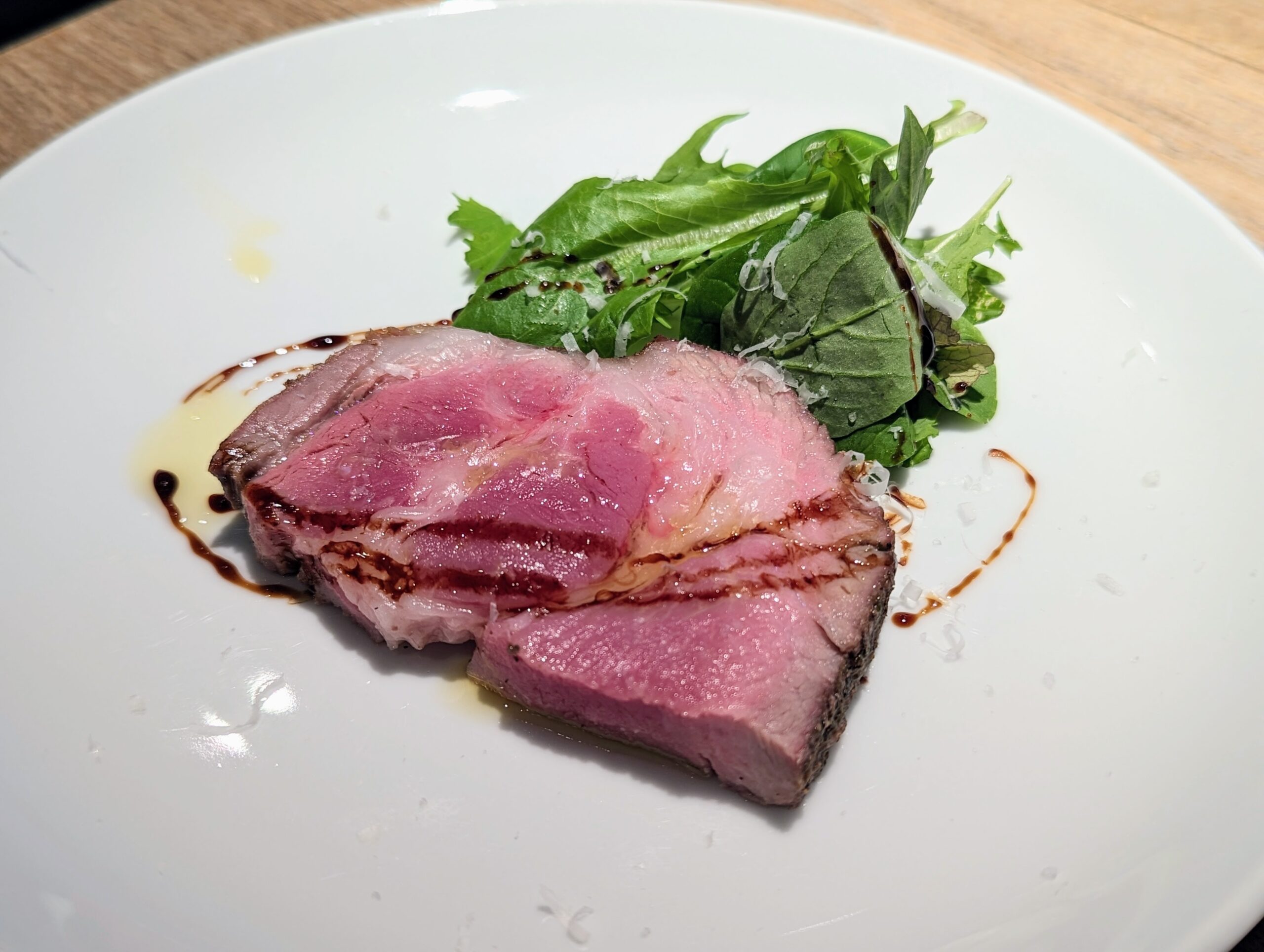 見た目も綺麗な豚ローストが出てきました。すごくシンプルに調理をされていますが、火入れ具合は抜群。 豚肉の甘みを最大限に引き出しており、塩とオリーブオイル、バルサミコ酢で味づけしています。