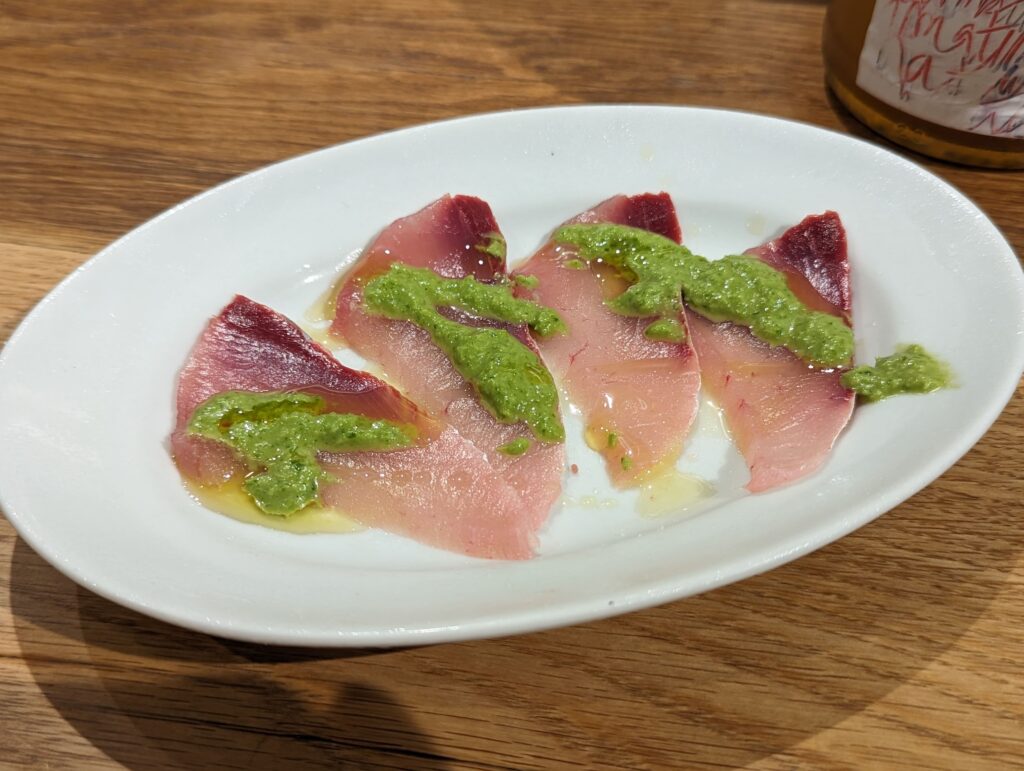 脂の乗った新鮮なワラサにジェノベーゼソース。 ワインにも合いますね。