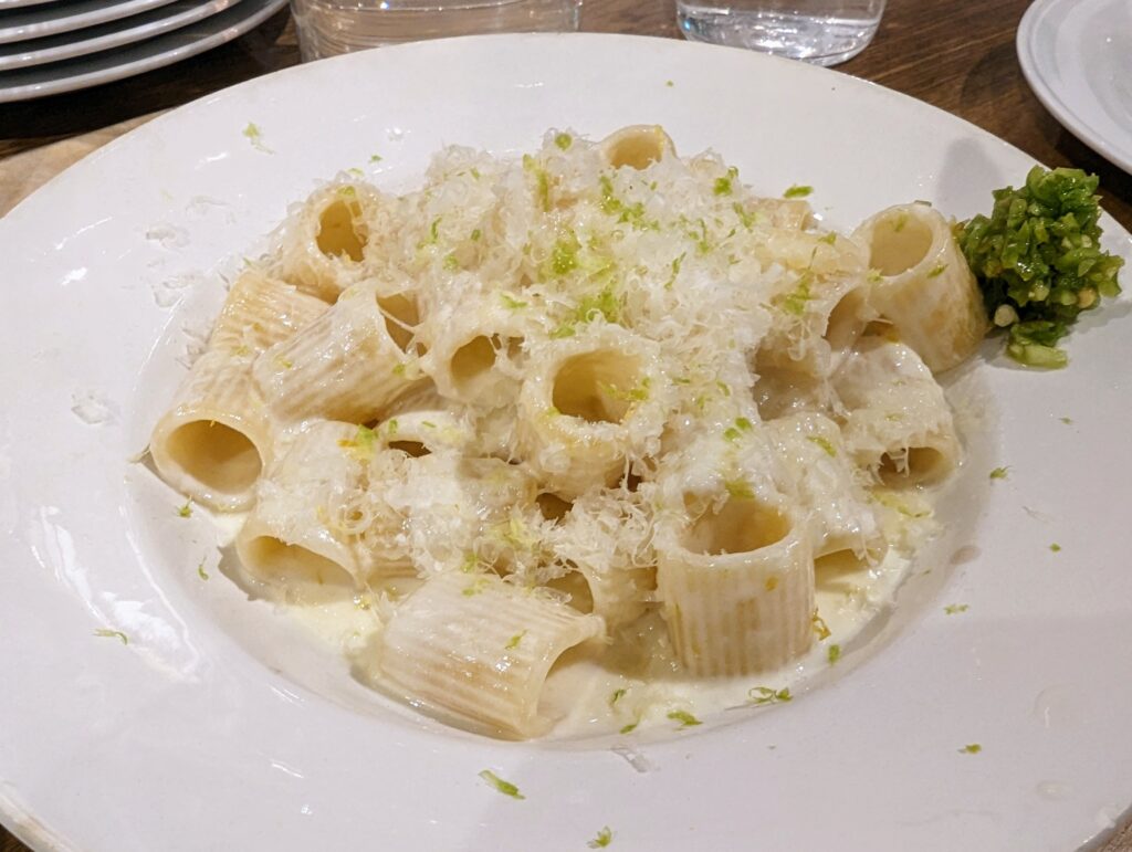 イタリア語で「半袖」という意味の太い筒状のショートパスタを使い、濃厚なクリームソースにレモンや青唐辛子で爽やかさをプラス。ワインのアテとしてもよく合います。