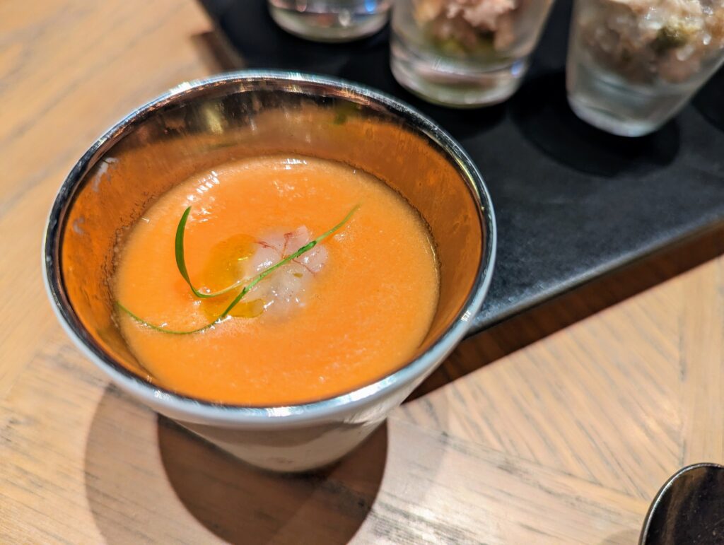 トマトの酸味に海老の旨味、冷製でさっぱりとしたスープです。