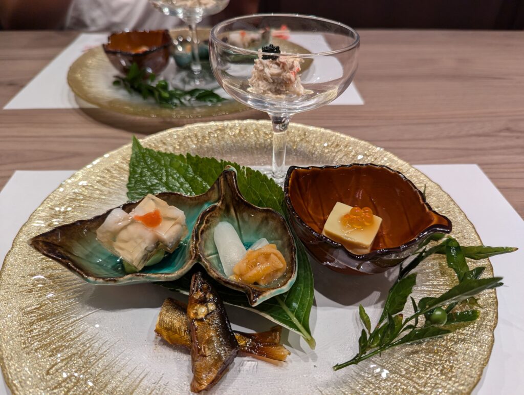 鱧の煮凝り、ほやの塩辛、卵豆腐、鮎の甘露煮、蟹サラダなど。 夏らしい食材を使った上品な一口サイズの前菜でした。
