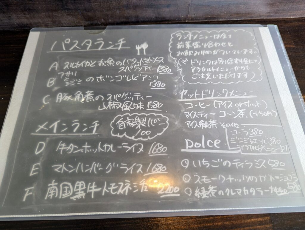 店内はカウンターのみの小さなお店。 ランチはパスタランチ3種類とメインランチ3種類から選べます。 今回、私が選んだのは**「スルメイカとお魚のバタートマトソーススパゲティ」(1380円)。** 前菜の盛り合わせとドリンクが付くのも嬉しいポイントです。