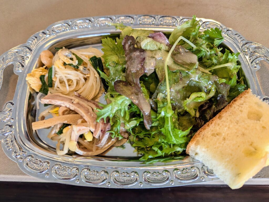 まずは前菜の登場。サラダにビーフン、中華サラダ、そしてフォカッチャまで。イタリアンの枠を超えた創作性豊かな一皿。 意外性がありますね。