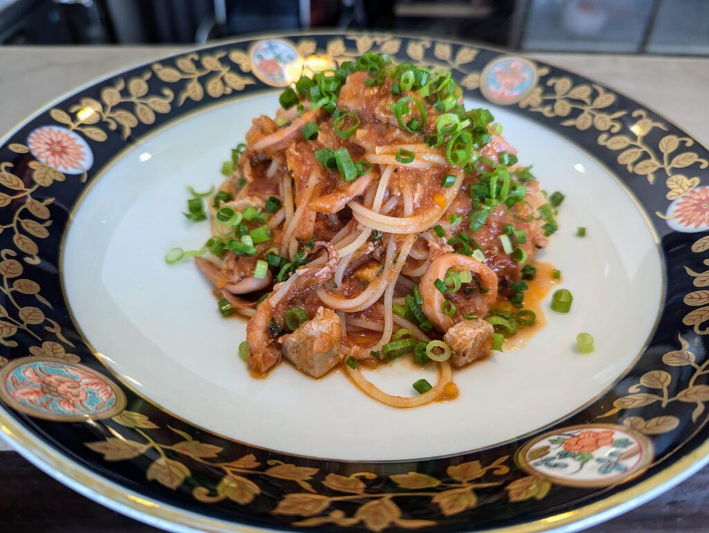 そしてメインのパスタが運ばれてきました。 細めのスパゲティにバターの効いたトマトソースとスルメイカとお魚の旨味染み出して、 しっかりと味が絡んでいます。