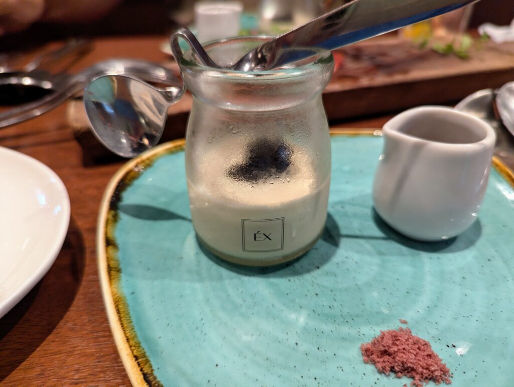 キャビアがアクセントのクリーミーで濃厚なプリン。 付随の甘い蜜や塩をつけていただくと味変も楽しめます。
