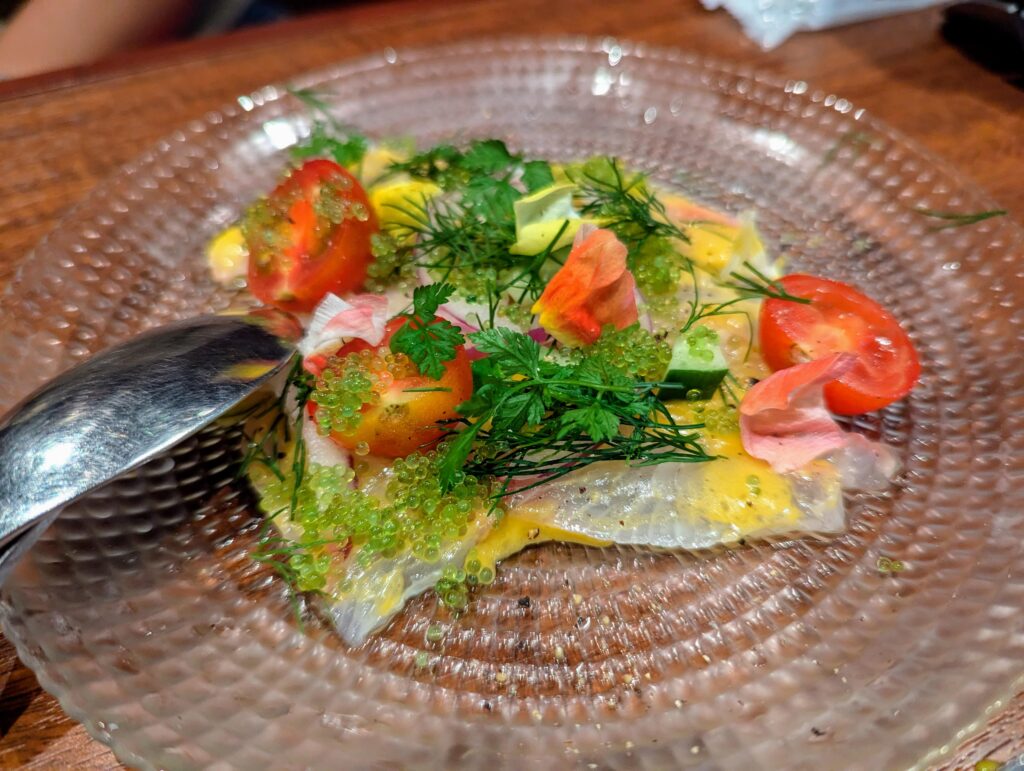鮮魚にハーブやトマト、とびっこなど組み合わせており、カラフルで複雑みのある味。 見た目もカラフルでいいですね。