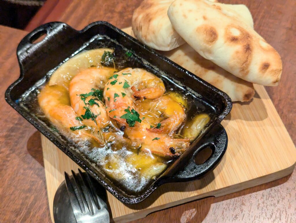 大ぶりなエビをアヒージョで。付け合わせにナンのようなパンもついてきます。