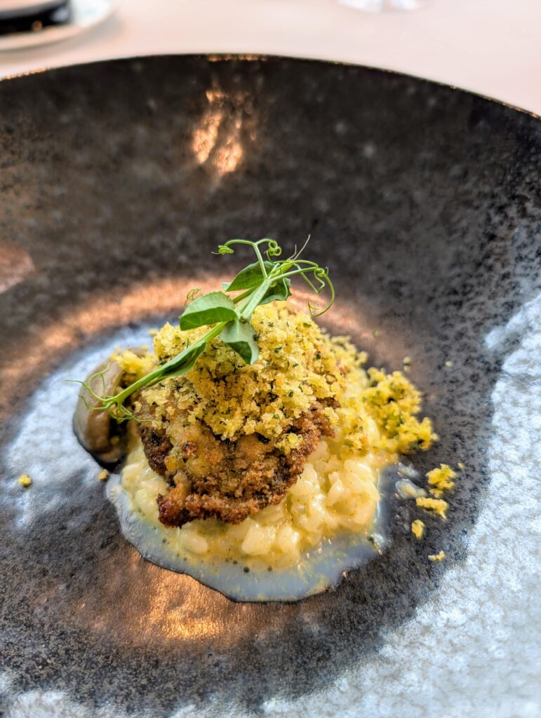 次に「スペシャリテ 鮑のペルシィヤード <苔庭の香り>」(+2,500円)をいただきました。 桜チップのスモークに満たされた蓋を外すと、煙と燻製の香りが立ち上る演出が素敵。 リゾットの上に鮑とペルシヤード(刻んだパセリやニンニクを混ぜたパン粉)が乗っており、 見た目は「Moss=苔」をイメージしているとのこと。