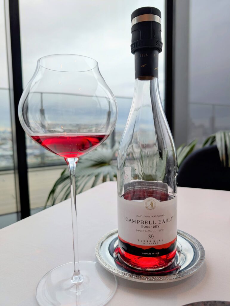 合わせたのは日本ワインのロゼ「都農ワインのキャンベル・アーリードライ」。 辛口でチャーミングな味わいが料理を引き立てていました。