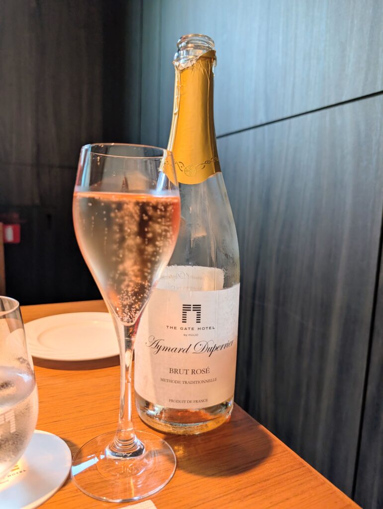 もちろん、ドリンクはロゼスパークリングで! ホテルのロゴが入っており、ワインにもこだわりを感じます。